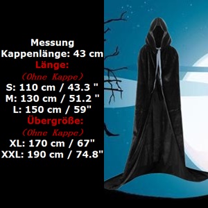 Bodenlang: Bitte achten Sie auf die Angaben der Größe im Bild. Falls Sie eine bodenlange Kappe bevorzugen, wählen Sie den empfohlenen großen Size. Für eine kniehohe Kappe können Sie stattdessen einen etwas kleineren Size wählen.