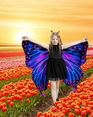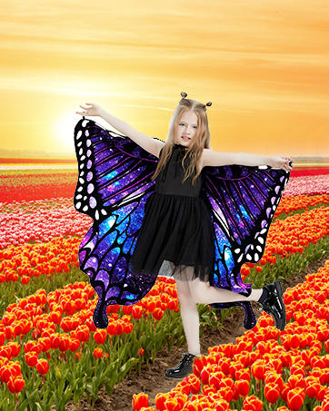 🦋 Einfach Anzuziehen - Mit einem verstellbaren Nackenriemen und Fingerschlaufen kann Ihr Kind das Kostüm gut an- und ausziehen. Es wurde für eine sichere und bequeme Anpassung aller Größe eingerichtet. Ein einfaches Umwickeln der Flügel und Fingerstecken in die Schlaufen genügt für eine schnelle Verwandlung.